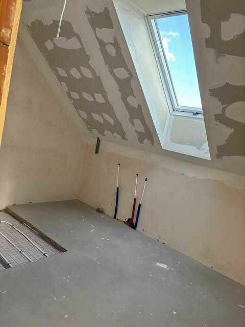 Piętro- główna sypialnia o pow. ok. 24m2 z wyjściem na balkon (możliwość podziału pomieszczenia na dwa mniejsze), dwie sypialnie (każda po ok.10m2), garderoba z oknem oraz pokój kąpielowy (łącznie ok. 70m2).