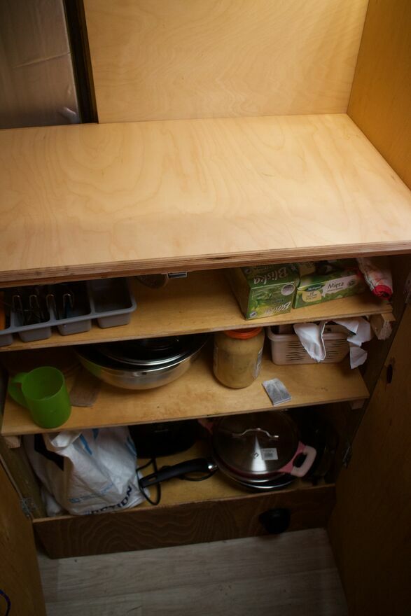 Podwieszana szafka na łóżkiem na ubrania, szafka kuchenna, oraz słupek.