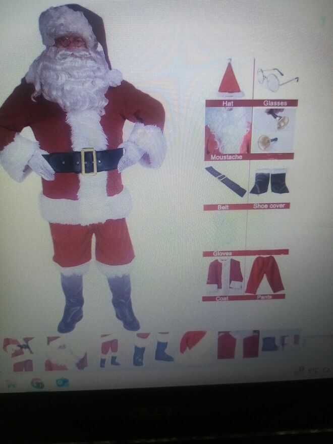strój mikołaja 9 części , założony tylko do przymiarki. Strój zawiera: bluzę, spodnie, czapkę, brodę, okulary, rękawiczki, pasek, dzwonekkrzysiek